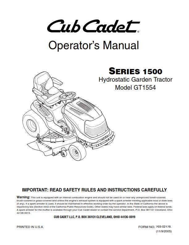 Cub Cadet - Operator Manual - Series 1500 - Hydrostatic Garden Tractor - Model GT1554